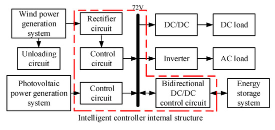 The intelligent control part includes wind power rectifier circuit, unloading circuit and its Boost control circuit, photovoltaic power generation Boost control circuit and bidirectional Buck/Boost circuit. The specific parameters of each circuit component need to refer to the maximum load power consumption and average daily power generation. At the same time, the maximum power consumption is helpful to select the appropriate inverters, and the average daily power generation is helpful to allocate the capacity of wind, light and storage reasonably [12].
