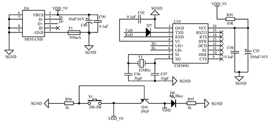 The upper side of Figure 4 is the USB serial communication circuit, which is used to display some data of the program running through the serial port assistant, which is helpful for debugging the program. It uses the CH340 chip for level conversion, which realizes communication between the MCU and the computer. Compared with the traditional 9-pin serial interface, it greatly reduces the component size and is more convenient. The lower side buttons, triodes and Light Emitting Diode (LED) lights enable program download and power indication.