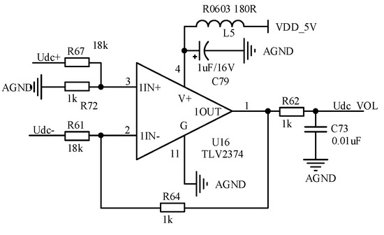 In the voltage acquisition, a differential proportional amplifier circuit is used, which is composed of a single-supply rail-to-rail input and output four-channel operational amplifier TLV2374 produced by Texas Instruments and its peripheral resistors. It has a high common-mode signal rejection ratio and high input resistance. When the pin of the control core is used for ADC acquisition, the maximum input is 5 V, and the maximum DC voltage in the entire power supply system does not exceed 90 V, so the voltage division ratio is 18:1. The voltage acquisition output is input to the ADC acquisition pin of the main control chip through the RC low-pass filter circuit.