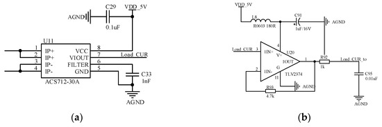 The chip-level Hall current sensor is connected in series in the current loop, its peripheral circuit is simple; it has a milli-ohm path resistance built in; the primary current flows only from the inside of the chip, and there is no contact with the secondary circuit, so that the primary secondary side is isolated. The operating temperature is −40 °C to 85 °C, the accuracy of the full temperature range is ± 1.5%, The input-domain output in the range of measurement has a good linear relationship Vout = 0.5Vcc + Ip*0.066. The Vcc power supply of the ACS712 is generally recommended to use 5 V, and the output voltage signal is between 0.5 V and 4.5 V. Figure 6b shows the signal conditioning section. The four-channel TLV2374 forms a voltage follower to increase the output impedance, and then filters out the interference through the low-pass filter circuit and outputs it to the ADC pin of the master.