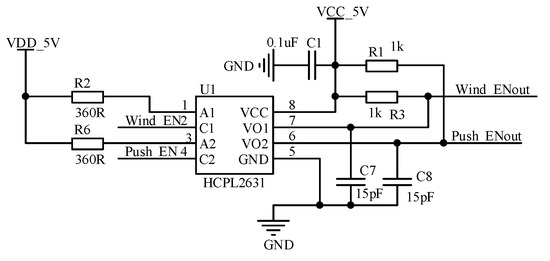 This paper selects the ON Semiconductor HCPL2631 optocoupler to realize the power circuit cut-out and transmission of the Unicom signal and the high-speed transmission of the switching tube PWM signal. The HCPL2631 features a dual-channel high-speed optocoupler with 10Mbps data rate and 10 kV/μs common-mode rejection (CMR) to minimize control signal delay and distortion. One of the isolation circuits is shown in Figure 7.