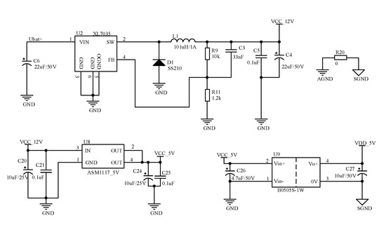 The electric energy is provided by a storage battery, after passing through the XL7035, it becomes a DC voltage supply of 12 V for the MOS transistor driver chip. XL7035 is an efficient, high voltage step-down DC-DC converter. It provides a wide input voltage range from 10 V to 80 V. The output voltage is adjustable from 1.25 V to 20 V, providing a maximum 1 A output current capability. The 5 V power supply is then supplied to the main control chip, op amp and current sensor through the B0505S isolated DC/DC. The combination of the optocoupler and the B0505S achieves a double isolation of the signal and of the power supply, respectively, separating the power ground from the analog ground and the digital ground. The 0 Ω resistor connection between the analog ground and the digital ground isolates the interference, ensuring the stability of the circuit.