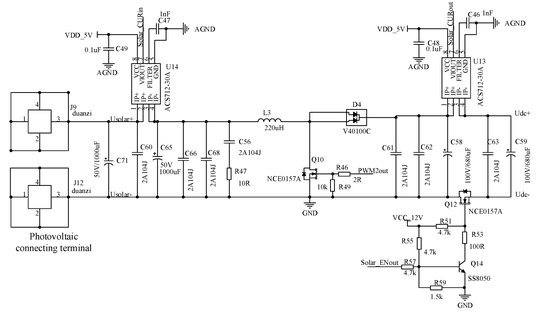 The main circuit of photovoltaic power generation is shown in Figure 11. This circuit is also a Boost structure, and will not be described here. The rated power of the PV array is 750 W, the rated input voltage is 30 V, the inductor ripple factor is 10%, the voltage ripple factor is 1%, and the switching frequency of the main power tube is set to 48 kHz. After calculation, the main circuit inductance of the photovoltaic power generation is taken as 220 μH, the output filter capacitor is 680 μF and 0.1 μF, and the input capacitance is 1000 μF and 0.1 μF.