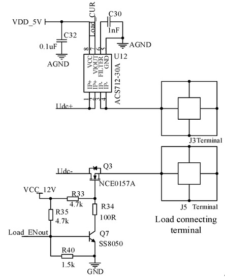 The load control circuit is shown in Figure 13. The bus current is connected to the terminal through the load current sensor, and Q3 controls the on and off of the side.