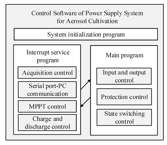 In this section, based on the Keil programming environment, the software part of the power supply system for aerosol stereo cultivation is compiled in C language. The system software is mainly divided into three parts: The system initialization program, main program and interruption service program. The overall structure of the software is shown in Figure 14. The acquisition control of the ADC, wind turbine, photovoltaic control, battery charge and discharge control and unloading control are sequentially executed every 5 ms in the main timer interrupt service routine. In the serial interrupt service program, it mainly completes the communication between the serial port and PC, and sends the related data and status information written in the main program to the serial assistant.