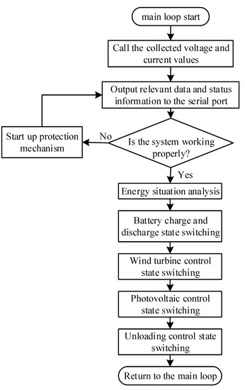 The next step in the energy analysis is based upon the power management strategy of the power supply system in Table 2. Based on the collected information, the relevant logical judgments are made to make decisions. The relevant flag bit is judged in the timer interrupt, and the control program is started.