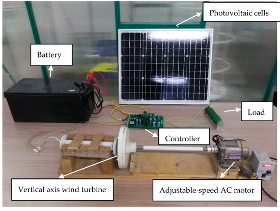 After completing the software and hardware debugging of the module, a 100 W power generation system, composed of a 50 W vertical axis wind turbine and 50 W photovoltaic panels, was tested in the laboratory environment. The test platform is shown in Figure 16.