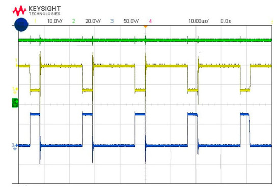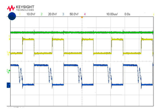 The green line is its output voltage, which is 20 V per cell and about 72 V. The yellow line is the GS waveform of the power switch MOS transistor. The value of each cell is 5 V, its frequency is 48 kHZ, the amplitude is 12 V, and the duty ratio is 60% at rated output. The blue line is the DS waveform of the power switch MOS transistor, each cell is 50 V, and its peak value is the same as the output voltage. It can be seen from the figure that the output voltage is basically stable, but the voltage spikes appear in the GS, DS, and output voltage waveforms at the instant when the power switch is turned on, mainly because the circuit does not have a design peak absorption.