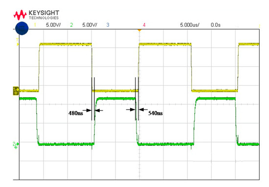 The yellow line in the figure is the GS waveform of the main power switch MOS with a duty cycle of 53.155%, and the green line is the GS waveform of the vice-transistor with a duty cycle of 41.718%. The two waveforms complement each other, and the turn on and turn off dead zones are 540 ns and 480 ns, respectively. The value of each cell in the figure is 5 V, and the amplitudes of the two waveforms are 12 V. However, voltage spikes occur at the turn-on and turn-off time, with peak values reaching 13.1 V and 13.9 V respectively.