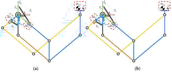 In Equations (6) and (7), and represent the masses of the two counterweights and and represent the extended link length of link and . These four parameters are used as variables for adjustable balancing when the tool at the distal end of this mechanism is changed with another one with a different mass.