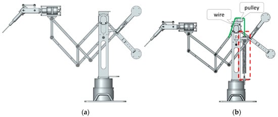 Gravity compensation methods are currently applied to various mechanism designs. A gravity-balancing mechanism design with auxiliary parallelograms was investigated by Agrawal et al. []. Agrawal and Fattah [] also used auxiliary parallelograms to design a reactionless 3-DOF planar parallel mechanism. Briot et al. [] designed a statically balanced and partial decoupled PAMINSA by adding counterweights at some axes of the pantograph linkages. In the design of a haptic mechanism, Tahmasebi et al. [] designed a five-bar parallel mechanism by using an actuator as a counterweight. In the design of a service robot, Kim and Song [] designed a novel multi-DOF gravity balancing robot arm by attaching compression springs at each joint. Employing double parallelograms made it possible to counterbalance a multi-DOF robot arm through the use of springs, and their practical design was also very compact.