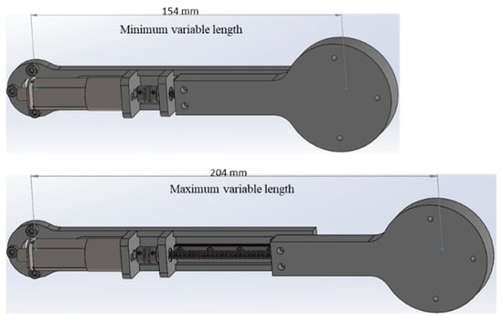 To control the extended link length of the counterweight, we designed a linear motion actuator, as shown in Figure 6. This motor is grounded at the left end of the link, and it extends the length of the link to the right. The variable range of motion is 50 mm. The variable length is also calculated via an encoder sensor mounted on the linear motion actuator.
