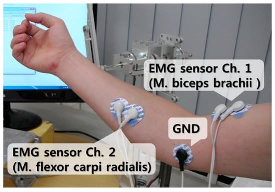 The effectiveness of the proposed gravity balancing mechanism was verified by using electromyography (EMG) sensors. The specification of the EMG sensor employed in this study is included in Appendix B. As more force is applied to the muscles, a greater EMG signal is generated. EMG sensors were attached to the M. biceps brachii and flexor carpi radial, as shown in Figure 9. The muscle signals of four users were measured. The flexor carpi radialis is responsible for the rotational motion of the wrist, and the M. biceps brachii is the muscle responsible for the rotational motion of the forearm. These two muscles are located on the outermost side of the skin and have the largest volume. Thus, we decided that these two muscles were the best place to measure signals.
