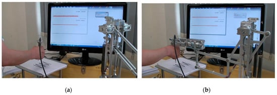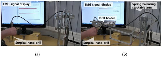 Figure 10a shows an experiment in which the user holds the surgical hand drill in the air. Figure 10b shows an experiment in which the surgical hand drill is held at the distal end of the gravity balancing arm. Then, the signal of an EMG sensor attached at the M. biceps brachii is measured in a stationary position. Only the signals of the M. biceps brachii were measured, because the flexor carpi radialis does not contribute to lifting the forearm.
