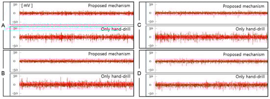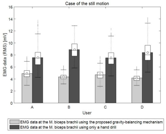 Figure 11 shows the raw data of the EMG signal for about 10 s for the two cases. Four users (referred to as A, B, C, and D) participated in the experiment. Figure 12 denotes the average RMS of the EMG raw data of the M. biceps brachii in a stationary position. Thus, it can be concluded that in the case of using the proposed mechanism, muscle fatigue is reduced because the average RMS using the gravity balancing mechanism is smaller than the case using only the hand drill.