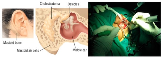 The developed otologic surgical robot was applied to a mastoidectomy, which is a surgical procedure that removes the infected portion of a mastoid bone. A mastoidectomy is a common procedure to access the inner ear area. Figure 18 shows the process of a mastoidectomy.