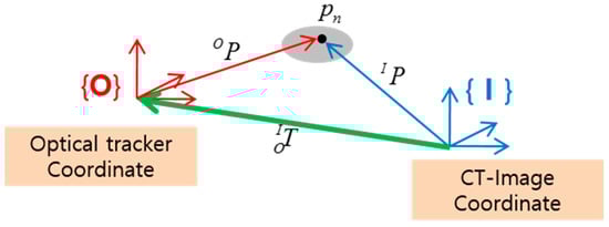 In order to integrate the navigation system with the robotic system, the patient coordinates must be registered to the CT image coordinates. The registration is done in order to find the corresponding points in the preoperative CT image data and the points on the patient’s anatomy on the operating table. Figure 20 shows the coordinate transformation between the CT image coordinates and the optical tracker coordinates. The feature point is , and is the homogenous transformation matrix that relates the optical tracker (i.e., patient) coordinate system to the image coordinate system. Six feature points were used for registration.