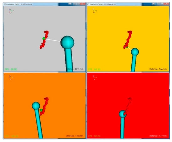 The surgeon can monitor a target lesion, the relevant organs, and the surgical drill in real-time using the image-guided navigation system. Figure 21 shows the navigation software, including the warning algorithm. The warning algorithm helps the surgeon prevent the surgical drill burr from entering critical organs.