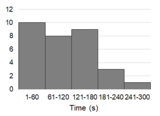 Application use time: The participants used the application for 116.5 s on average (SD: 65.4 s). As shown in Figure 2, most of the participants used it for less than 3 minutes. They usually looked into the recommended teas and their information after inputting their preferred flavor, health benefits, and drinking time. While some only looked into the recommended teas, there were some participants who checked other screens such as the tea list page and looked at all the tea information provided by the application. Four participants used the application for more than 3 minutes.