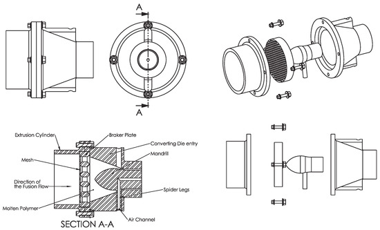 The insulator of the electrical conductors are applied using a plastic extrusion machine whose schematic cut is displayed in Figure 1. A die-nozzle is inserted in the head. The equipment is complemented with a hopper feeding polymer granules and dryer, which are not shown.