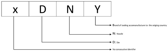 The project was carried out in a manufacturing industry supplier of the automotive sector, in the City of Queretaro, Mexico. The name of the company is not mentioned for reasons of confidentiality. What follows is a census of data was made in the process of extrusion of insulating material in 23-AWG wire. The results were compared vs. the manufacturing standards of each die-nozzle models. Figure 2 depicts the representation of die-nozzle, one manufactured domestically and four imported. Figure 3 shows the tooling code. The data processing was computed by using Minitab v18® [25].