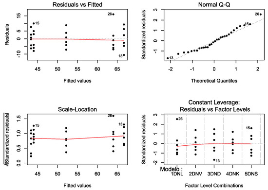 The results of the data analysis of the three production lines with the monthly data of the period under study demonstrates the behavior of the operating variables included in the performance evaluation affects the die-nozzle pair, illustrates for this case [35]. Table 2A shows that average life. Table 2B displays the average km of electrical conductor produced with each die-nozzle model. Table 2C shows the scrap generated [36]. To validate the employed model, graphical analysis was run. Figure 5 describes the evidence, which is often an assumption, randomness and, homogeneity of variance were accurate for each ANOVA analysis.