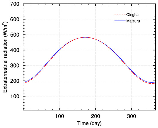 where is the solar constant (1367 W/m), n is the day of the year, is the latitude of the location in degree, is the declination angle in degree and is the sunset hour angle in degree. The horizontal extraterrestrial radiation is a function of the day of year and latitude. Thus, the at two target sites (i.e., Maizuru and Qinghai) in Japan and China for all years can be easily obtained (Figure 1) and then used to calculate clearness index that is used to define the sky conditions in this study.