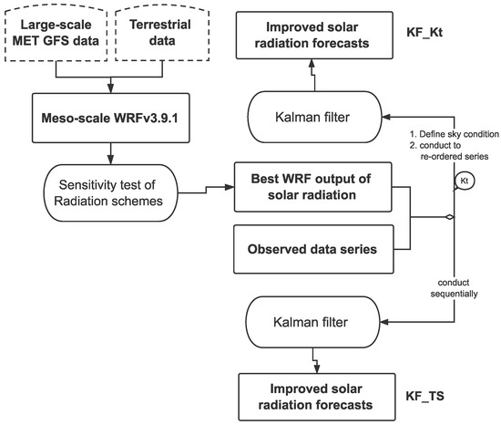 We summarize the hybrid day-ahead solar radiation forecasting model described in Figure 2. The procedure mainly involves two steps, that is, the solar radiation from WRFv3.9.1 model given the best configuration of radiation schemes and the implementing Kalman filter considering the clearness index. In order to validate whether the forecasts from the novel hybrid model can be improved, a controlled experiment is conducted as displayed in Figure 2: