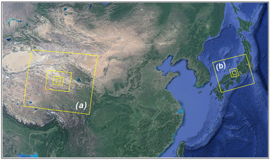 Domain configurations of the WRF (Weather Research and Forecasting) model for Qinghai (a) and Maizuru (b) sites in Japan and China, respectively. This image is taken from Google Earth.