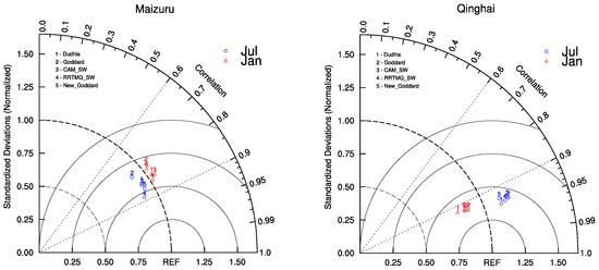 Taylor diagrams for Maizuru (left) and Qinghai (right) sites. The diagrams show normalized standard derivations and correlations of solar radiation forecasts for five experiments referred to observations (REF) in winter (January) and summer (July). The number of samples for each experiment is 336.
