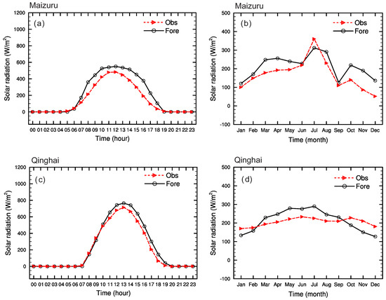 The 12-month mean solar radiation (W/m) series from 12:00 a.m. to 11:00 p.m. (a) and the monthly averaged series of 2018 solar radiation (b) for the Maizuru site; (c) and (d) display similar results but for the Qinghai site in 2017. Note that the time mentioned is local time. The marked black and red lines stand for forecasts and the corresponding observations, respectively.