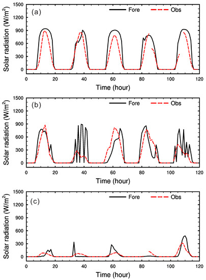 The solar radiation (W/m) series over five days of clear (a), cloudy (b) and overcast (c) sky conditions for the Maizuru site. The solid black and dotted red lines stand for forecasts and the corresponding observations, respectively.