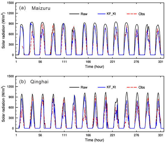 The comparison of the WRF model and KF_Kt forecasts of solar radiation under clear sky conditions is plotted in Figure 7. It presents hourly WRF raw forecasts (black line) and observed solar radiation at the target site (red line) as well as the KF_Kt predictions (blue line) for a period of 14 days. It is observed from Figure 7a that the WRF model demonstrates the capability of predicting the day-ahead solar radiation at the Maizuru site. Nevertheless, the KF_Kt can improve the raw prediction of the WRF model significantly, with reductions of MBE by 90.1% and RMSE by 43.4%. As expected, from Figure 7b, we also can see the positive impact of KF_Kt on the WRF raw solar prediction for the Qinghai site.