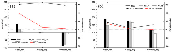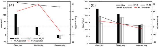 The characteristics of MBE and RMSE for the Qinghai site are summarized in Figure 9. The significant advantage of KF_Kt against KF_TS for reducing the systematical errors can be found in Figure 9a. The corrections of MBE by KF_Kt are all around 90% for three sky conditions. As in the case of MBE, RMSE (Figure 9b) of KF_Kt are consistently much smaller than KF_TS under different sky conditions.