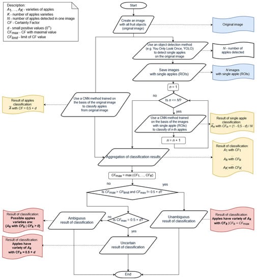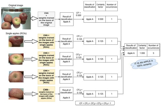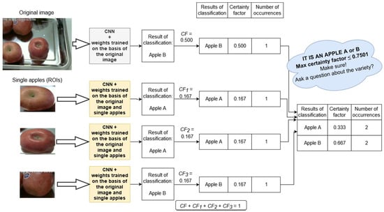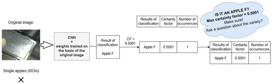 The You Only Look Once (YOLO) method was used to extract images of individual objects from the original images. The fruit variety classification was done based on each nth ROI image (). For this purpose, the previously described nine-layer CNN was used. It was trained with the ROI images. Each result of the classification (each CNN inference) was provided with the appropriate value of certainty factor :