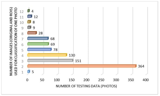 The proposed fruit classification method was tested for the same dataset with six different apple varieties. In this method, one photo classification was associated with classifications of a few images (one original image and ROI images). The amount of testing data according to the number of images for one photo classification is presented in Figure 2. It is evident that the most cases (364 photos) concerned the classification of an apple based on one original image and one ROI image (this was a photo with one apple or a photo on which the YOLO method detected only one apple object). In the dataset, there were photos for which the YOLO method failed to identify any fruit (five photos). The YOLO method detected the most fruits (as many as 11) in four cases.