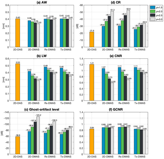 Quantitative analyses of each beamforming method with p values ranging from 1.5 to 3.0 are shown in Figure 2. Though Figure 2a,b shows that the image resolution generally improves with p value for all DMAS methods, it should be noted that the change of AW with p value is minor for Rx-DMAS and Tx-DMAS. On the contrary, only the AW in 2D-DMAS significantly decreases from 0.38 mm to 0.33 mm when the p value increases from 1.5 to 3.0. For LW, on the other hand, all 2D-DMAS, Rx-DMAS, and Tx-DMAS demonstrate a lower LW with the increase of p value. Among them, note that 2D-DMAS consistently provides the lowest LW when the same p value is considered. Figure 2c also shows that the resultant ghost-artifact level decreases with p value for all DMAS methods but that 2D-DMAS consistently outperforms the other two. For p = 2.0 as an example, the corresponding ghost-artifact levels are −90.8, −81.5, and −73.5 dB, respectively, for 2D-DMAS, Rx-DMAS, and Tx-DMAS. For image contrast, Figure 2d shows that the CR markedly improves with p value, especially for 2D-DMAS and Rx-DMAS. However, it should be indicated in Figure 2e that the conventional 2D-DAS still provides the highest CNR while 2D-DMAS has the lowest due to the elevated granular pattern in the speckle background. Note that the difference in CNR between 2D-DMAS and the other DMAS counterparts becomes relatively minor with decreasing p value. For example, the CNRs are respectively 0.59, 0.69, and 0.89 for 2D-DMAS, Rx-DMAS, and Tx-DMAS when p = 3.0. This corresponds to a CNR difference of 0.3 between 2D-DMAS and Tx-DMAS. However, when p decreases to 2.0, the CNR becomes respectively 0.89, 0.96, and 1.02 for 2D-DMAS, Rx-DMAS, and Tx-DMAS. In other words, the CNR difference between 2D-DMAS and Tx-DMAS now decreases to 0.13. When the GCNR is considered, however, it should be noted that 2D-DMAS and Rx-DMAS outperforms 2D-DAS. In other words, 2D-DMAS and Rx-DMAS indeed provide improvements in image contrast even with the elevated speckle variation.