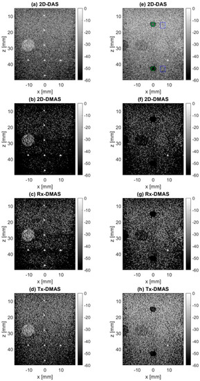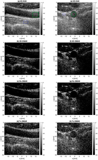 The experimental B-mode images in Figure 3a–d with p = 2.0 show that, compared to the 2D-DAS counterpart, all three DMAS beamforming can make the wire reflectors stand out from the speckle background. This is expected since the echoes from the wire reflectors have much higher signal coherences than those from speckle scatterers. Consequently, the image magnitude of the speckle background appears to be relatively suppressed in any DMAS beamforming. Note that, among the three DMAS beamforming methods, the suppression of speckle background is the most obvious for 2D-DMAS and is the least for Tx-DMAS. Moreover, both 2D-DMAS and Rx-DMAS exhibit noticeable dark-region artifacts around the wire reflectors and the hyperechoic cyst while the dark-region artifacts are relatively alleviated for Tx-DMAS. Figure 3e–h further shows that the edge of cysts gets clearer in all three DMAS beamforming methods due to the lower clutter artifacts within the anechoic regions. The 2D-DMAS exhibits the lowest clutter level compared to the Rx-DMAS and Tx-DMAS beamforming but at the cost of reduced magnitude and elevated variation of speckle background. These observations are consistent with those in the simulation results.