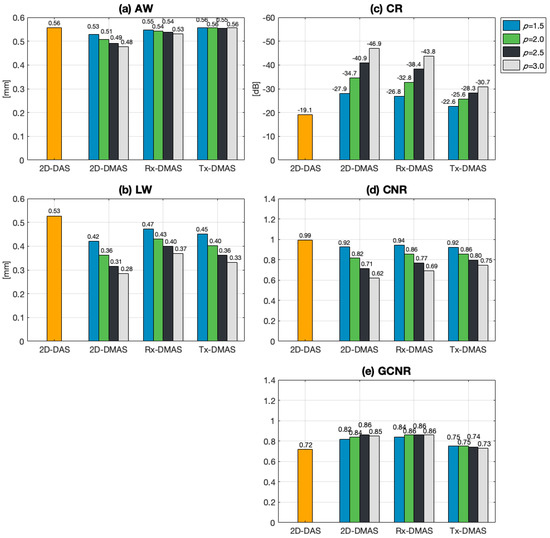 Quantitative analyses of experimental B-mode images for the DMAS beamforming method with different p values are shown in Figure 4. The experimental results are generally similar to those in the simulations. Figure 4a,b shows that the image resolution is the highest for 2D-DMAS when the same p value is considered. For example, the LW decreases from 0.53 mm for the 2D-DAS reference to 0.36 mm for 2D-DMAS with p = 2.0. This corresponds to an improvement of 32% in lateral resolution. In Figure 4c, it is also demonstrated that the image CR of the anechoic cyst significantly improves for 2D-DMAS and Rx-DMAS respectively by 15.6 dB and 13.7 dB relative to the 2D-DAS reference. Nonetheless, the results in Figure 4d indicate that the conventional 2D-DAS still provides a higher CNR than all three DMAS beamforming methods. For p = 2.0, the CNRs are respectively 0.82, 0.86, and 0.86 for 2D-DMAS, Rx-DMAS, and Tx-DMAS while that for 2D-DAS is 0.99. On the other hand, all DMAS beamforming methods result in higher GCNR than 2D-DAS especially for 2D-DMAS and Rx-DMAS.