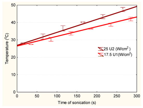 Thermosonication can be classified into two groups: sublethal (below 45 °C) and lethal (above 45 °C [17,37]. The purpose of the experiment was to select sonication parameters so that the final juice temperature remained in both the sublethal and lethal thermosonication range. The final juice temperature was the result of the combination of juice volume (200 mL), ultrasound intensity, and processing time (300 s), and was 42.5 °C and 48.5 °C for 17.5 W cm−2 (U1) and 25 W cm−2 (U2) intensity, respectively. Changes in juice temperature during ultrasound treatment are presented in Figure 2.