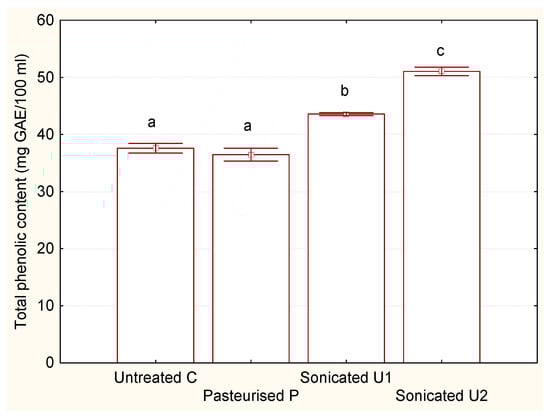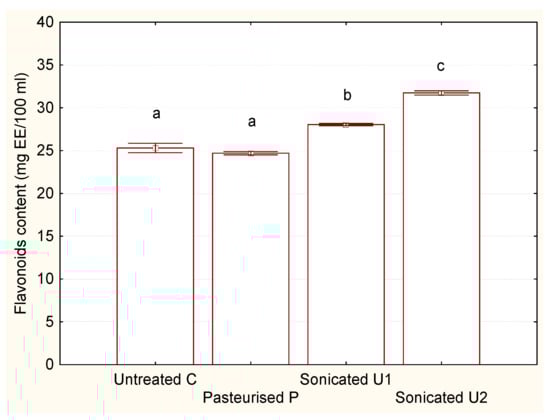 Figure 3 and Figure 4 present the influence of various treatment methods on the polyphenol and flavonoid content in apple juice. Pasteurization did not influence the polyphenol content in comparison to control sample. In the case of samples subjected to the action of ultrasound, a statistically significant increase in the value of the tested parameter was observed. This change relative to control amounted to 16% for treatment U1 (17.5 W cm−2) and 36% for treatment U2 (25 W cm−2).
