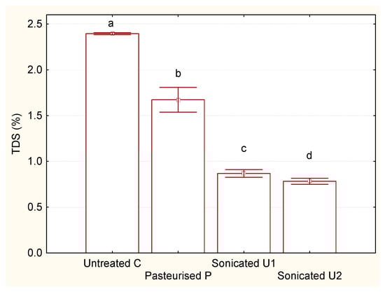 The reason for the increased cloud value in sonicated apple juice is mechanisms induced by cavitation. These phenomena cause a breakdown of solid particles of juice and facilitate its homogenization. Seshadri et al. [51] suggested that ultrasound may break linear pectin molecules and reduce the molecular weight of complex compounds. Comparing treatments U1 and U2, it is worth noting that increased ultrasonic intensity caused a significant decrease (p < 0.05) in cloud value. This may be related to the increased sonic energy and further reduction of suspended particles, providing greater transparency of apple juice.