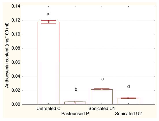 Results concerning the influence of various types of treatment of apple juice on anthocyanin content are presented in Figure 8. All applied methods of juice preservation resulted in a considerable decrease of anthocyanin content. The most unfavorable influence was exhibited by pasteurization, which showed as much as a 97% decrease of anthocyanin content. In the case of ultrasound treatment, the decrease of anthocyanin content depended on the force of ultrasound and amounted to 92% for 17.5 W·cm−2 intensity (treatment U1) and 82% for 25 W·cm−2 intensity (treatment U2).