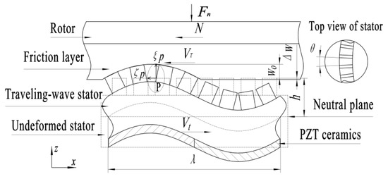 When the motor is working, the rotor with friction material is pressed against the traveling wave stator under the preload. Because the friction layer is softer than the rotor material, it can be assumed that only the friction layer is subjected to contact deformation, with the rotor itself not undergoing elastic deformation. When the motor is not working, the compression of the friction layer is