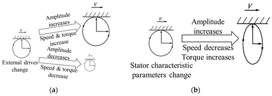 At present, low-speed–high-torque characteristics are reflected mainly in standing wave motors, especially the longitudinal–torsional hybrid motor, and are difficult to achieve in traveling wave motors because the normal and tangential vibrations of the stator elliptical motion of a hybrid motor are independent. However, the normal and tangential vibrations are coupled in a traveling wave motor; that is, the tangential displacement of a stator surface particle is induced by the normal bending vibration [22,23]. Therefore, increasing (respectively, decreasing) the normal motion component, which means the normal amplitude and can represent the maximum stall torque, will inevitably increase (respectively, decrease) the tangential motion component, which means the tangential velocity can represent the limiting speed. From the perspective of the mechanism of elliptical motion, when the external drives are adjusted, an increase or decrease of the amplitude can be considered as enlargement or reduction of the elliptical motion trajectory, as shown in Figure 3a.