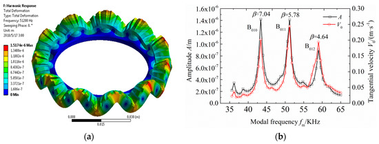 The material properties of the 70H stator are given in Table 1. Piezoelectric ceramic is a smart material that has elastic constants, piezoelectric constants, and permittivity constants. The damping ratio was set to 0.8% and the driving voltage was set to 100 Vpp [24,25]. The working mode of the finite element method (FEM) simulation is shown in Figure 4a. The simulated vibration modal frequency of the stator was 51.2 kHz, the amplitude was 1.41 μm, the tangential velocity was 0.2435 m/s, and β was 5.79, as shown in Figure 4b.