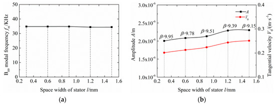 (a) Modal frequency affected by the space width of the stator and (b) amplitude affected by the space width of the stator.
