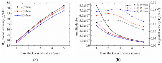 With the tooth spacing determined, the simulated effects of tooth height and base thickness on the stator vibration parameters could be ascertained and are shown in Figure 8. The thicker the stator base, the higher the modal frequency with a relationship that is approximately linear. When the base thickness was kept constant, the modal frequency and the amplitude decreased and the tangential velocity increased as the tooth height increased. In addition, as the base thickness was increased, the amplitude decreased sharply initially and then gently, and the tangential velocity increased initially and then decreased, which shows that the rotational speed is the result of multivariable coupling of the stator. The tooth height has an obvious influence on the tangential velocity. When the base thickness is small, the amplitude difference is also obvious whether there are stator teeth or not. When the base thickness and tooth height are smaller, the amplitude–velocity ratio is larger.