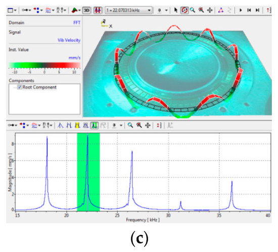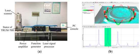 (a) PSV-300 scanning Doppler laser vibration measurement system; (b) measured mode of 70HA; and (c) measured mode of 70HB.