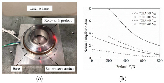 In order to test the amplitude of the stator with preload, a rotor with an outer diameter 4 mm smaller than that of the stator was made. Thus, the vibration of the stator teeth surface could be measured by laser scanning. When the excitation voltage was 100 Vpp, the normal amplitudes of 70HA and 70HB without preload were 1.4 μm and 3.5 μm, respectively; their amplitudes with a preload of 800 N were 0.2 μm and 0.5 μm, respectively. When the excitation voltage is 400 Vpp, the stator deformation will be larger without the compressed rotor, which will lead to ceramic breakage. Therefore, the minimum preload was set to 200 N. At this level, the normal amplitudes of 70HA and 70HB were 3.5 μm and 8.0 μm, respectively. An accompanying noise indicated that the preload was still too small. The amplitudes with a preload of 800 N were 0.6 μm and 2 μm, respectively. As shown in Figure 13, the test results show that the normal amplitude of the stator teeth surface decreases with increasing preload and increases with increasing excitation voltage. The stator amplitude during operation of the motor was maintained above 1 μm, and the larger the stator amplitude without the rotor, the greater the preload that can be applied.